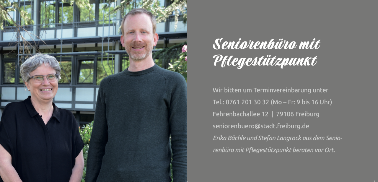 Das Seniorenbüro mit Pflegestützpunkt ist eine Beratungsstelle für die Bürgerinnen und Bürger der Stadt Freiburg und berät zu den unterschiedlichsten Themen, Hilfen und Angeboten in Ihrem Stadtteil.